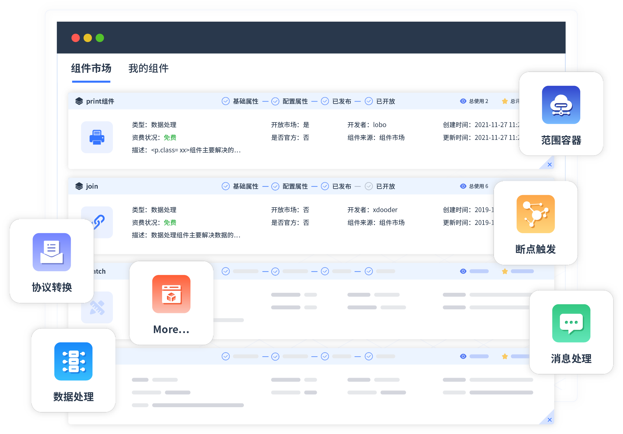 针对集成场景,,小米钱包提供组件市场,,例如协议转换、、、、消息处理、、、文件操作等。。除平台提供的组件外,,客户可以自定义所需组件。。。。