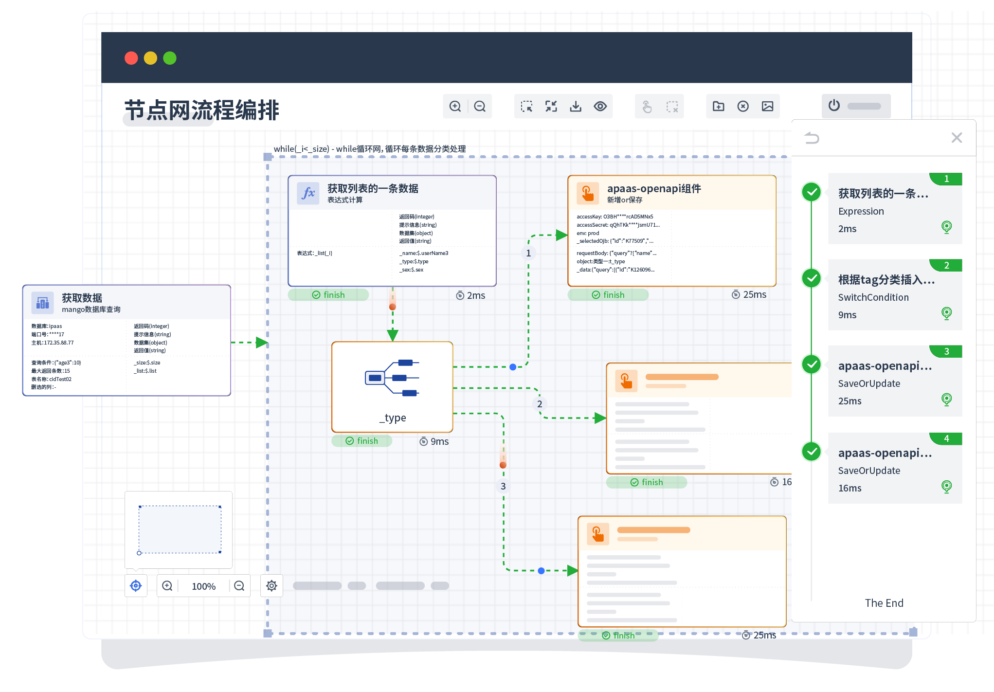 针对集成场景,,组件定义后支持进行流程编制,,不同于传统代码方式,,,通过图形化展示,,,支持在线调试、、、、日志查看和运行回放。。